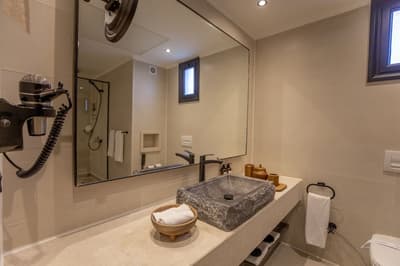 Idéale pour un séjour romantique, elle comporte des équipements modernes et offre des vues fascinantes sur le jardin ou partiellement sur la mer ou encore sur la piscine que vous pourrez contempler sur la terrasse ou le balcon aménagés. À noter qu’une chambre connectée peut être disponible.