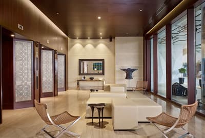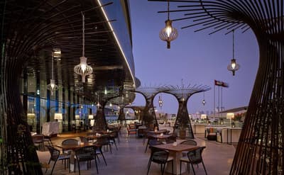 J'espère que vous n'êtes pas sujet au vertige ! Le Grand Hyatt Abu Dhabi, le bien nommé, est logé dans une tour de 255 mètres de hauteur ! Avec sa forme de tapis roulé sur lui-même, ce gratte-ciel est remarquable entre tous. Sa formidable rampe d'accès figure un collier de perles, qui se transforme en une rivière de diamants à la nuit tombée. Son socle évoque un écran de télévision à la fois vintage et futuriste, et à travers lequel on voit distinctement les différentes galeries de circulation qui sertissent le hall d'accueil. Ce dernier est un véritable manifeste du design, usant d'un savant jeu de contrastes et de couleurs pour donner davantage d'intensité à chacune des scénographies. L'extérieur fait tout autant partie du décor, les architectes ayant ménagé de fabuleuses terrasses panoramiques. Le truc dingue, c'est cette piste de course qu'ils ont eul'idée de greffer au 3ème étage et qui entoure le bâtiment sur 350 mètres. Le long de ce parcours, ont été installés en plus de la salle de fitness, quelques appareils de cardio et de musculation pour apprécier la vue et le coucher de soleil ! Avec ses 50 mètres de longueur, la piscine en forme de fer à cheval, n'en est pas moins impressionnante...