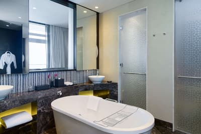 Idéale pour un séjour paisible avec votre compagnon de route, elle profite de lits jumeaux et offre une vue exceptionnelle sur la ville que vous pourrez contempler du balcon privé. Elle dispose de fenêtres allant du sol au plafond qui laissent pénétrer la lumière naturelle dans toute la pièce. À noter que des chambres communicantes sont disponibles.