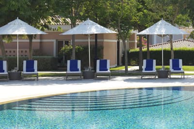 Il y a d'abord le bâtiment principal, dont l'esprit Renaissance vénitien ne vous échappera pas, puis ce magnifique parterre de pelouses et palmiers qui encerclent l'immense piscine de l'hôtel. Original, le bassin est trapézoïdal, avec une très belle mosaïque, et planté de deux auvents pour l'ombre. Les transats vont jusqu'à la plage. Les jardins, soit 23 hectares au total, sont magnifiquement entretenus. Le buis taillé en topiaire, les oliviers et les lauriers roses créent comme une oasis. D'ailleurs, les fontaines chantonnent. La proximité immédiate avec la Grande Mosquée Sheikh Zayed ajoute à la féérie des lieux. D'autres bâtiments et villas sont dispersés de chaque côté de l'espace piscine. Il s'agit en réalité d'un domaine très étendu, avec vue sur le Grand Canal. Autant vous dire que la piste de jogging qui le traverse ne saura vous lasser ! Après l'effort, le réconfort... Que diriez-vous d'une glace au Dolce, le resto italien ? Ou alors d'un thé à la menthe en terrasse, au Mijana ? Ou encore d'un Afternoon Tea à l'Alba ? Vous aurez ici autant de moments à vivre et à partager qu'il y a d'univers à découvrir dans ce superbe resort...
