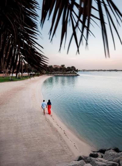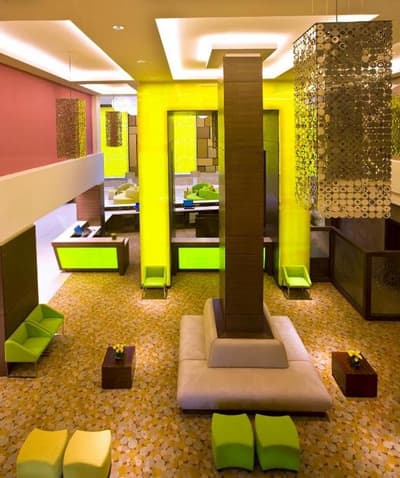 Ne vous fiez pas aux apparences car le bâtiment lui-même n'a rien de particulièrement attrayant ! Il s'agit juste d'un building à taille humaine, moderne certes mais rien à voir avec l'architecture en verre des gratte-ciels environnant. Sa couleur sable se fond avec celle de la plage qui s'étend à ses pieds. Les salons de jardin invitent à la détente et la terrasse du restaurant face à la mer est plus qu'appréciable. Quand bien même vous seriez ici pour affaires, le goût des vacances ne serait pas très loin ! Au contraire de la façade extérieure, le hall détonne ! On se croirait dans une boîte à bonbons. C'est coloré, pop, design même, inattendu pour le moins. La transparence est de mise, certains panneaux en verre jaune couvrent toute la hauteur, les sofas sont jaune poussin et vert anis, les pots à fleurs jouent aussi de la couleur et les luminaires suspendus imitent des cocons de chenille ! Les chambres sont plus sages, dans la veine des hôtels urbains et inernationaux. Raison pour laquelle vous passerez sans doute plus de temps dans ces grandes cabanas qui font aussi office de majlis où poser votre laptop, boire un thé à la menthe puis fumer la shisha...