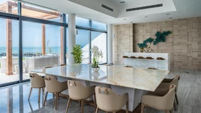 Installée en bord de mer, elle profite d’une vue superbe et d’un cadre exceptionnel ! D’une dimension générale, la terrasse est aménagée d’une petite piscine et dispose d’un lit de séjour. Incroyablement spacieuse, elle accueille 4 chambres, une grande salle à manger et profite d’une cuisine complètement équipée. 5 salles de bains surdimensionnées avec baignoires et douches à effet de pluie.