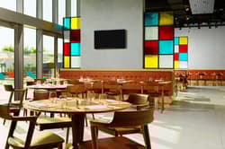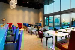 La promenade passante, bordée de palmiers, qui longe d'un côté le canal et de l'autre, l'hôtel, a des airs de promenade des Anglais. C'est elle que vous contemplerez depuis votre balcon ou que vous arpenterez le matin ou le soir, à la fraîche, pour faire votre jogging. Dans le lobby, les couleurs pètent, les surfs sont suspendus au plafond, et le mot "chill" s'invite sur les étagères comme un mot d'ordre. Ces couleurs, on les retrouve des chambres aux restaurants, en passant par la piscine à débordement et la plage privée, avec leurs transats et serviettes flashy. Insolite est le Lunchador Rooftop Cantina & Lounge ! Sur le toit-terrasse, il fait face au Burj Al Ararab, de l'autre côté de la rive. Le cadre lui, emprunte tous les codes à l'esthétique mexicaine, de ces imprimés roses, verts et jaunes, de ces mosaïques caractéristiques, et de ces fresques murales typiques qui dépaysent ! Il fait à la fois resto et bar. Ce dernier d'ailleurs, se trouve en extérieur, sous une pergola ultra design. On s'accoude au comptoir avant d'aller s'asseoir sur des coussins néo-aztèques ou de danser sur des musiques latino. Cette ambiance est inattendue mais bienvenue quand vacances riment avec fête !