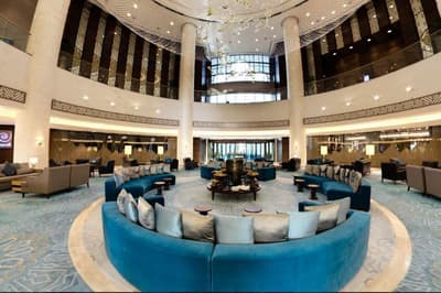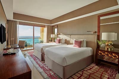 La plage qui court sur 200 mètres, est simplement magnifique, de surcroît protégée par deux digues. Face à elle, la piscine et ses cabanas façon majlis se sont entourées de frangipaniers et de palmiers. Derrière ce setting plutôt inspirant, le bâtiment s'élève progressivement de chaque côté, à l'image d'un escalier. Dans le lobby, vous serez happés par la hauteur de plafond, la lumière et cet immense salon circulaire, décoré d'arabesques et coiffé d'un lustre monumental qui comme dans un filet, semble vouloir emprisonner un banc de poissons argentés. Poétique ! Une terrasse le prolonge en surplombant un panorama fantastique. A la nuit tombée, vous y fumerez la shisha, avachi sur les coussins, en scrutant les étoiles, au son d'une musique lounge. Vos kids seront sans doute déjà couchés, après avoir enchaîné des jeux aquatiques, une chasse au trésor, un spectacle de magie et une projection au bord de la piscine ! Si l'architecture extérieure ne transpire pas les charmes du Moyen-Orient, l'intérieur vous en mettra plein la vue. C'est doré, coloré, brillant, parfois chargé, mais tant qu'à être venu jusqu'ici, autant jouer le jeu à 200% ! Et le spa en la matière est sublime...