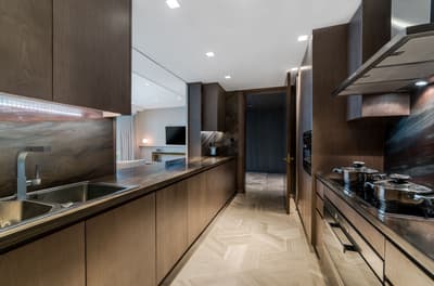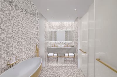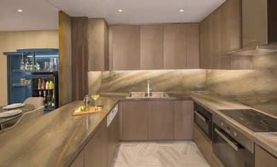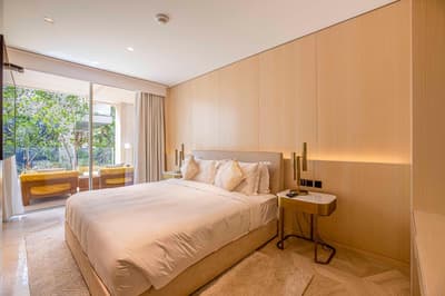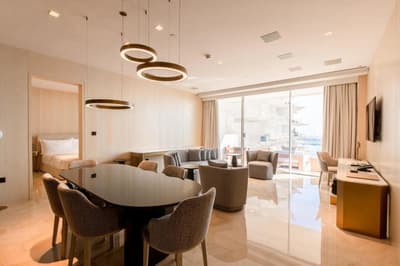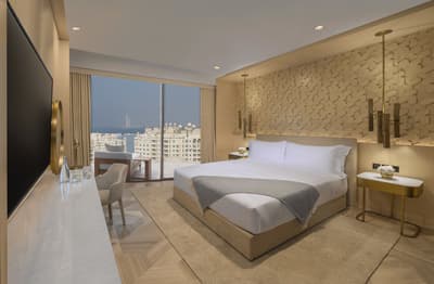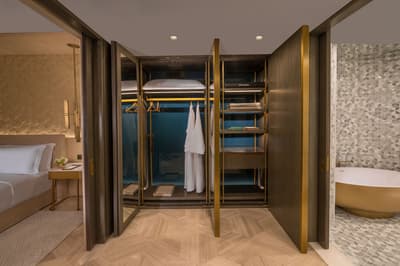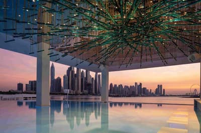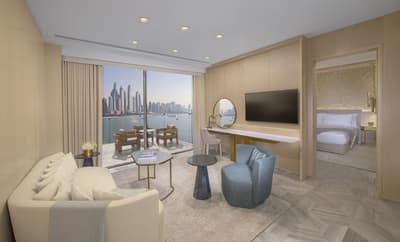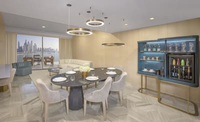 "Dine, drink, dance & relax", demandez le programme ! Le Five Palm Jumeirah est un temple de la fête : les terrasses sont des lieux de contemplation et de rencontres, la plage est le théâtre de multiples animations, et le champagne coule à flots autour d'une piscine qui en soirée s'habille de chandeliers... Et c'est aussi une prouesse architecturale : imaginez 16 étages ou le verre domine, en particulier dans l'élévation de cette porte monumentale, centrale, qui vous fera inévitablement penser à l'arche de La Défense à Paris ! Les balcons en saillie semblent voler. En guise d'accueil, l'entrée du bâtiment figure une structure de bois orientalisante dans un cube transparent. On retrouve d'ailleurs cette touche organique au spa, dans l'armature des cabanas. Superbes ! La piscine principale, tout en longueur, s'appelle la "social pool", c'est pour vous dire l'ambiance qui règne ici ! Il y a même des tables dedans pour faire pilier de bar... mais de luxe ! Quant à The Penthouse, c'est la cerise sur le gâteau... Une terrasse hallucinante face au coucher du soleil et à la skyline illuminée, qui, tout en marbre blanc, réfléchit toutes ces lumières. Après un verre, vous irez dîner à Shanghai ou presque, dans un cadre tout aussi impressionnant — la hauteur de plafond est saisissante ! Avant d'aller danser ou de prendre un bain de minuit dans cette piscine transparente ou dans l'intimité de votre jacuzzi...