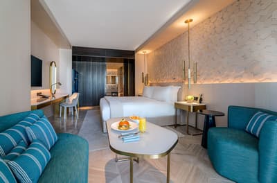 Superbe ! Face à la mer, le petit balcon aménagé de beaux fauteuils profite d’une vue reposante et sereine. Agréable et confortable, elle accommode un grand lit king et dispose d’un canapé dans le coin salon. Salle de bain avec douche à effet de pluie et baignoire.
