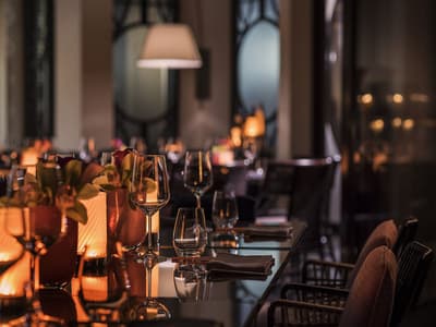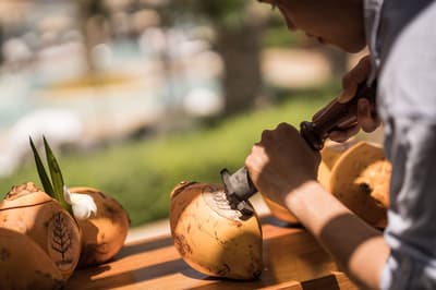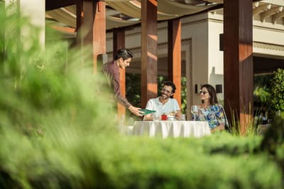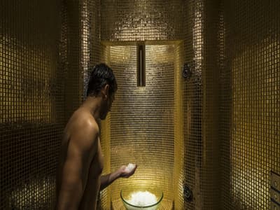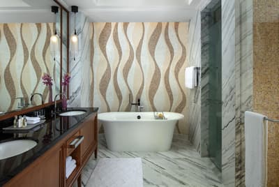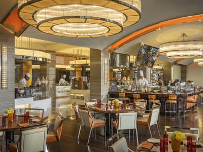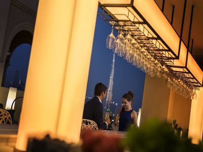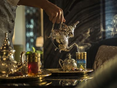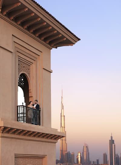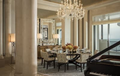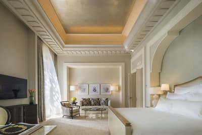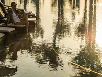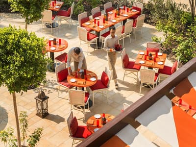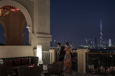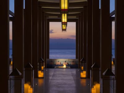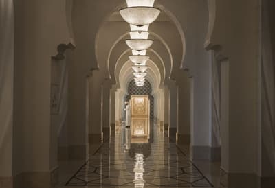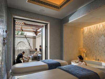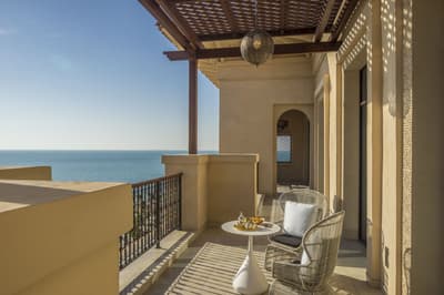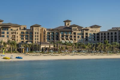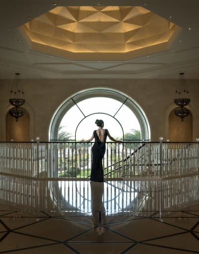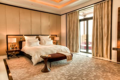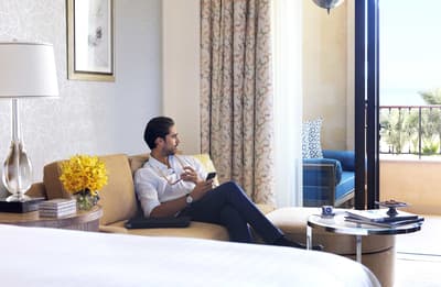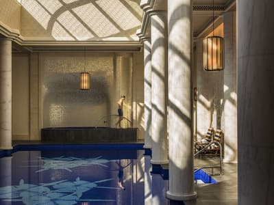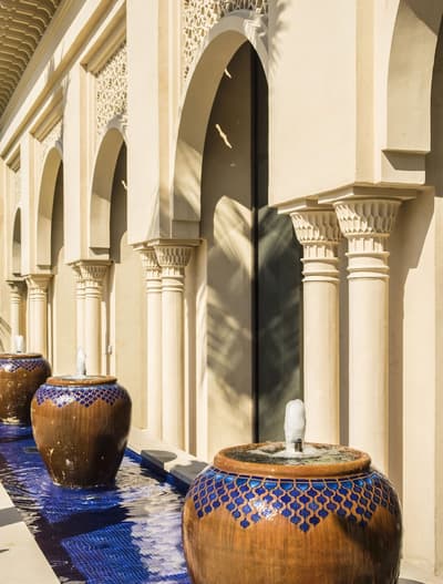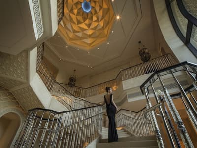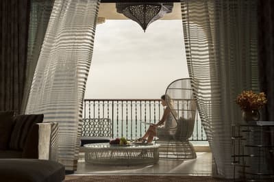 Dès votre arrivée, vous serez scotché par l'architecture ! On se croirait dans une forteresse du désert ! Ici, votre rêve d'Orient sera exaucé... Toits-terrasses, arcs outrepassés, mosaïques, muqarnas et moucharabiehs vous en mettent plein la vue. A l'intérieur, la préciosité des plafonds ferait passer l'hôtel pour la mosquée de Sainte-Sophie ! Il n'y a pas un espace qui ne raconte pas une histoire... Il y a le Shai Salon avec ses colonnes en onyx, son plafond ajouré, son enfilade de lustres en cristal et son tapis tissé de fils d'or. Détrompez-vous, ce n'est même pas kitsch ! Il y a le Hendricks Bar dans son habitacle de bois sombre, avec ses banquettes interminables et ses coussins roses et violets rutilants, sans oublier ses portraits de purs-sangs... Une sorte de club pour gentlemen, où refaire le monde en fumant un cigare. Il y a le Mercury Lounge, avec son bar façon soucoupe volante, top design, où tables et fauteuils forment de jolies fleurs stylisées. Ne comptez pas le nombre de palmiers à moins d'être insomniaque, car ce resort est une véritable oasis ! Au beau milieu, deux piscines paysagées font face à la mer. Vous les voyez ces coupes de champagne qui arrivent vers vous, flottant sur un plateau tout blanc ? Ce serait dommage de vous faire sortir de l'eau si le luxe peut venir à vous, non ? Et pour compenser certains excès, vous filerez en salle de fitness, perchée en haut du resort ! La vue est à couper le souffle... Voilà qui va stimuler votre cardio !