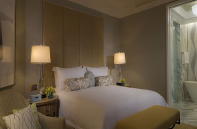 Cette belle chambre a tout le nécessaire pour un séjour des plus agréables et confortables. Le balcon est complètement aménagé et profite d’une vue reposante sur la ville vibrante. Elle accommode un grand lit king ou des lits queens pour les petites familles. Salle de bain chic avec baignoire.