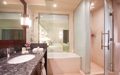 Encore plus spacieuse, c’est le top ! Installée aux étages supérieurs, le balcon profite d’une vue merveilleuse et superbe. Agréable et confortable, elle a tout ce qu’il faut pour un séjour des plus plaisants. Elle accommode un grand lit king ou des lits jumeaux. Salle de bain avec baignoire ou douche.