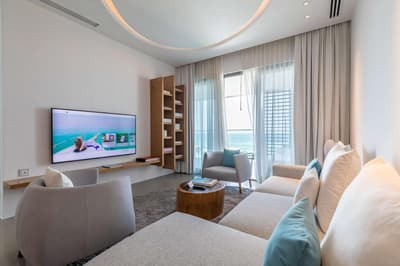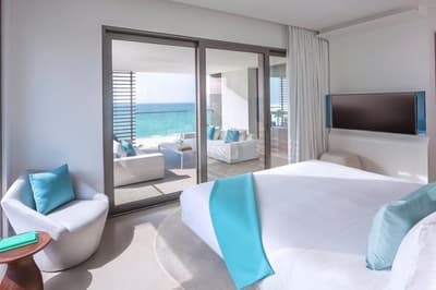D’une dimension généreuse, le balcon est aménagé de beaux canapés pour apprécier la vue merveilleuse sur la mer. Très spacieuse et confortable, elle dispose d’un salon meublé d’une table à manger et de fauteuils. Faite pour un séjour des plus romantiques, elle accommode un grand lit king. Salle de bain surdimensionnée avec baignoire et douche à effet de pluie.