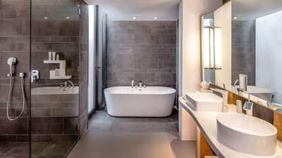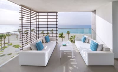 Le top ! Idéale pour une famille ou pour des amis, elle est spacieuse et superbe. D’une dimension généreuse, le balcon est aménagé de beaux canapés pour apprécier la vue merveilleuse sur la mer. Cette belle suite dispose de 2 chambres. Salle de bain surdimensionnée avec baignoire et douche à effet de pluie.