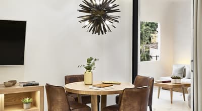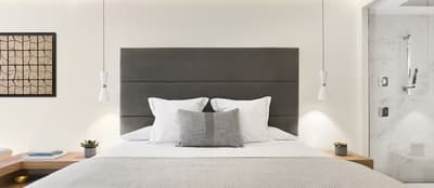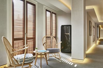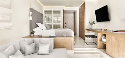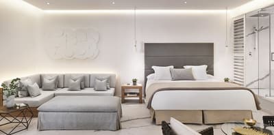 La décoration est dans un style épuré et contemporain avec un mobilier élégant en bois et coussins confortables, des couleurs douces et d'œuvres d'art minimalistes. La chambre est dotée d’un lit King size ou lits jumeaux sur demande et la grande salle de bains en marbre est équipée d’une douche à effet pluie et baignoire. Le tout dans une ambiance relaxante et cosy!