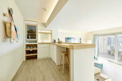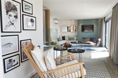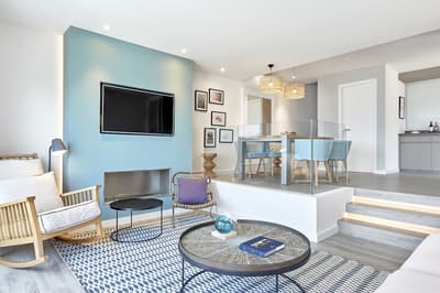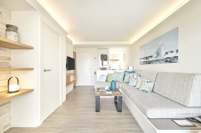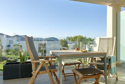 Plus spacieuse, elle offre confort et intimité. Son balcon aménagé de belles chaises profite d’une vue reposante sur le complexe. Salon meublé de banquettes et d’une petite table. Salle de bain chic avec douche.