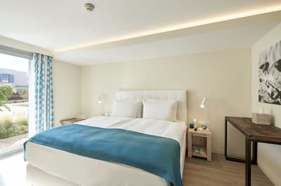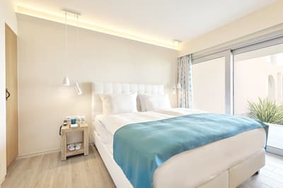 Cette belle chambre est installée autour de la piscine du complexe. Sa terrasse aménagée de belles chaises permet un accès privilégié à la piscine et est idéale pour apprécier le cadre. Coin salon meublé de banquettes et d’une petite table. Salle de bain chic avec douche.