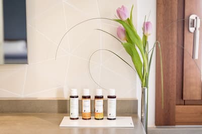 Plus spacieuse, elle offre encore plus de confort. Le balcon est aménagé de belles chaises pour apprécier la vue sur la végétation et la vieille ville. Petit coin salon meublé de fauteuils et d’un bureau. Salle de bain chic avec douche à effet de pluie.