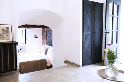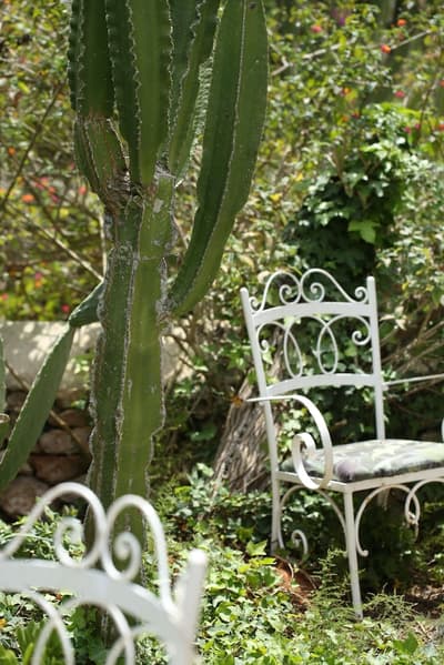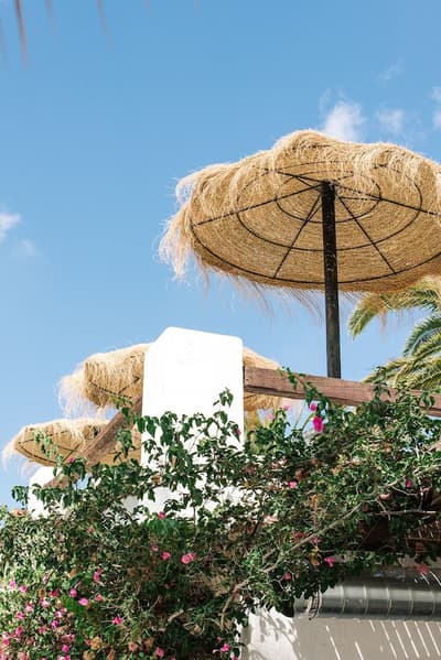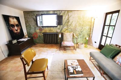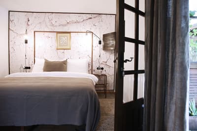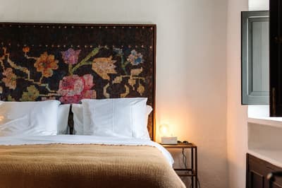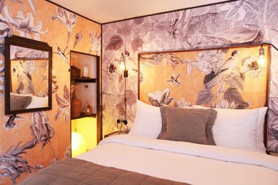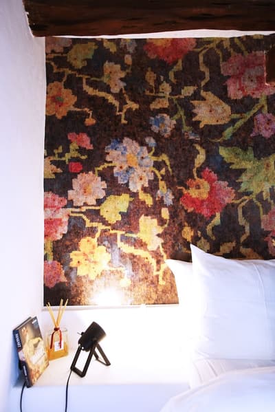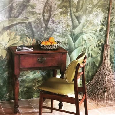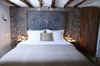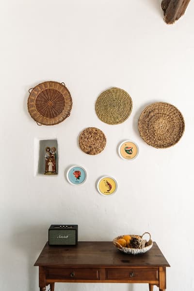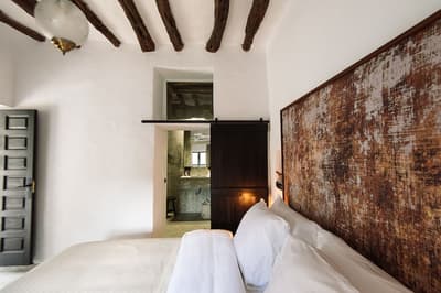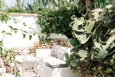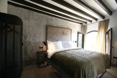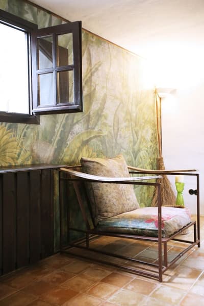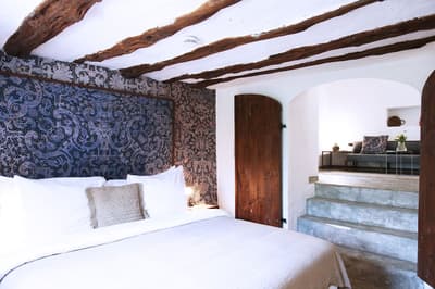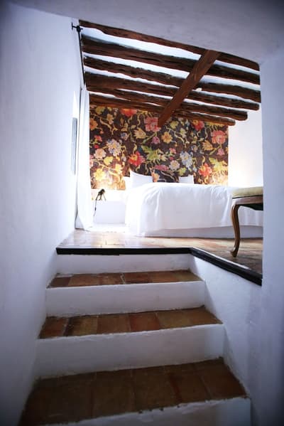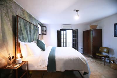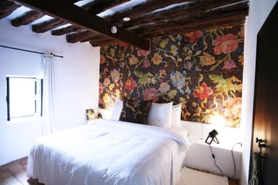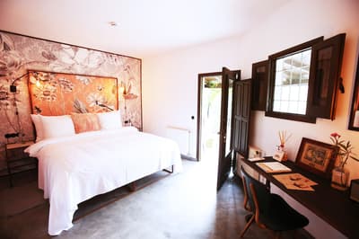 À la Finca Legado Ibiza, ce sont les propriétaires qui vous accueillent ! Andi et Andreas, pour les intimes… d’origine autrichienne mais amoureux du style de vie ibicenco. Aux côtés de Gino, le Jack Russell, gardien des lieux, et Ginger, le petit chat roux farceur. Voilà toute la famille ! Enfin, sans oublier les poules très sympathiques elles aussi. Bienvenue à la campagne ! Les collines environnantes, tapissées de pins, rythment vos journées de profonde relaxation. Tout pousse à profusion dans les jardins : bougainvilliers blancs et rose fuchsia, cactus et succulentes en tous genres, palmiers, oliviers, cyprès, citronniers et arbres fruitiers… Les oiseaux font leur petit gazouillis, les grenouilles coassent à la nuit tombée. C’est vraiment un paradis pour les sens. Les murs de pierre, les façades blanches, les portes en bois, le tracteur dans le champ à côté, les vignes non loin, les paniers remplis de fruits… on rêve éveillé ! Le design intérieur est signé Andi et c’est incroyable. On dirait qu’il y a un filtre vintage dans toutes les chambres. C’est rustique chic, c’est rough luxe, c’est de si bon goût. Chaque hébergement est différent et révèle un papier peint à motif unique, plutôt floral, végétal… Tous évoquent l’esprit brut de l’île, loin des clichés. Forcément, on adore !