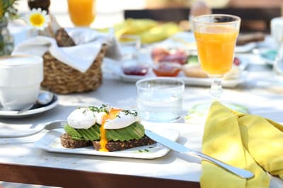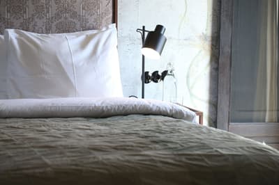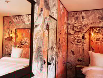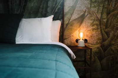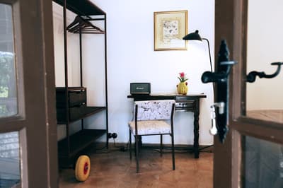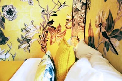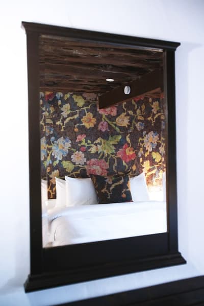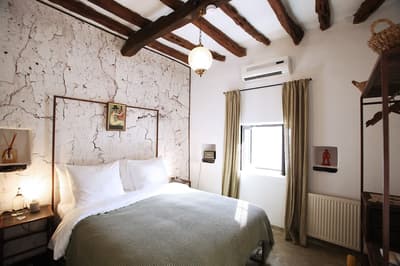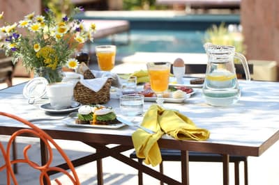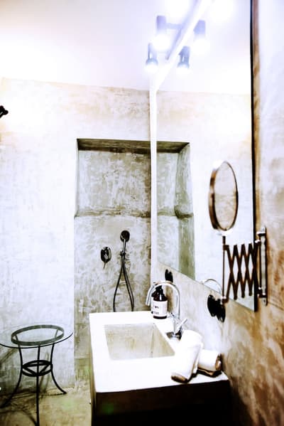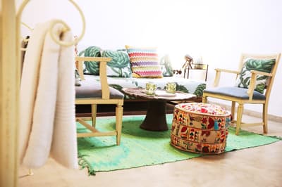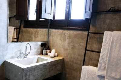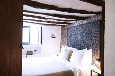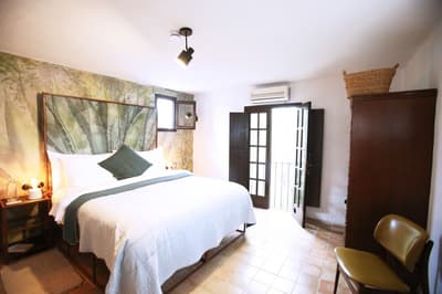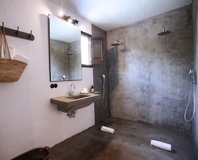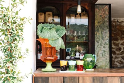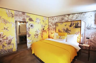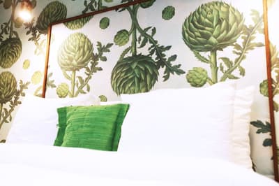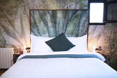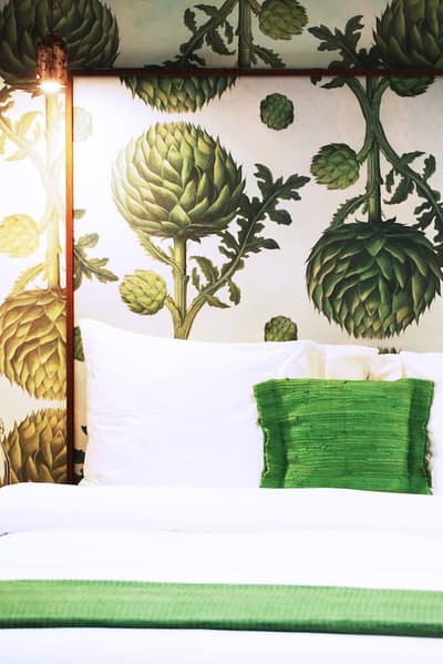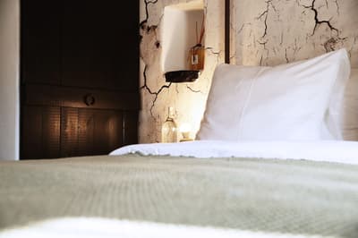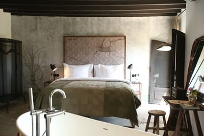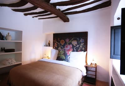 À la Finca Legado Ibiza, ce sont les propriétaires qui vous accueillent ! Andi et Andreas, pour les intimes… d’origine autrichienne mais amoureux du style de vie ibicenco. Aux côtés de Gino, le Jack Russell, gardien des lieux, et Ginger, le petit chat roux farceur. Voilà toute la famille ! Enfin, sans oublier les poules très sympathiques elles aussi. Bienvenue à la campagne ! Les collines environnantes, tapissées de pins, rythment vos journées de profonde relaxation. Tout pousse à profusion dans les jardins : bougainvilliers blancs et rose fuchsia, cactus et succulentes en tous genres, palmiers, oliviers, cyprès, citronniers et arbres fruitiers… Les oiseaux font leur petit gazouillis, les grenouilles coassent à la nuit tombée. C’est vraiment un paradis pour les sens. Les murs de pierre, les façades blanches, les portes en bois, le tracteur dans le champ à côté, les vignes non loin, les paniers remplis de fruits… on rêve éveillé ! Le design intérieur est signé Andi et c’est incroyable. On dirait qu’il y a un filtre vintage dans toutes les chambres. C’est rustique chic, c’est rough luxe, c’est de si bon goût. Chaque hébergement est différent et révèle un papier peint à motif unique, plutôt floral, végétal… Tous évoquent l’esprit brut de l’île, loin des clichés. Forcément, on adore !