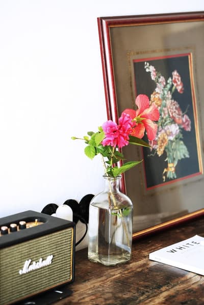 Simple et cosy, c’est une ambiance légère et harmonieuse. La grande baie vitrée laisse pénétrer la lumière naturelle dans la pièce. Elle mélange métal, verre et bois dans son ensemble pour une décoration élégante et raffinée. Quelques touches de couleurs la rendent vivante.