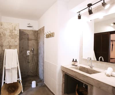 À proximité de la piscine, elle y offre un accès facile et privilégié. La terrasse est aménagée de fauteuils confortables pour apprécier la végétation luxuriante et le cadre reposant. Salle de bain chic avec douche à effet de pluie.