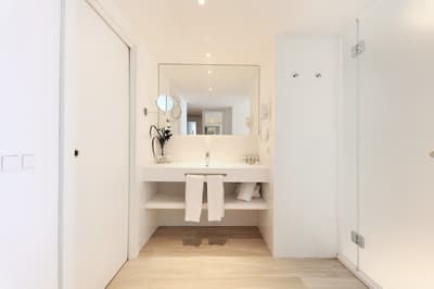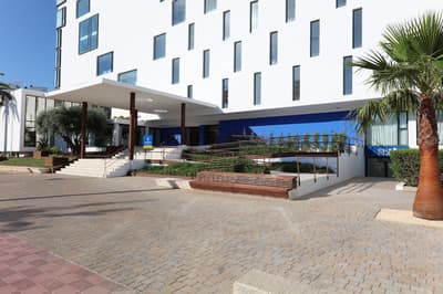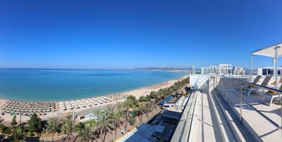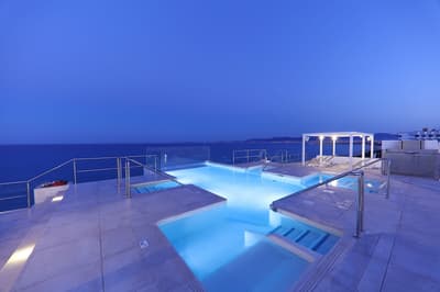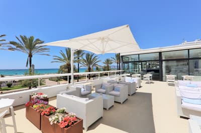 Depuis la plage on ne voit qu’elle : l’incroyable piscine à façade de verre perchée sur le rooftop de l’Iberostar Playa de Palma. Un petit détail qui annonce la couleur d'entrée : ici c’est le luxe et la démesure. C’est vrai que ce grand resort aux dimensions imposantes en jette, même si certains trouveront son architecture un peu froide. Mais une fois à l’intérieur, on va de surprise en surprise. Dans le hall d’entrée, vous tomberez nez à nez avec Filomena, la Vaca de Oro, comprenez vache en or, création fantaisiste d’un célèbre artiste espagnol. Ce qu’on adore ici, c’est le combo pop art & design contemporain mixé avec des éléments d’architecture plus traditionnels. Mais surtout, les designers ont imaginé une véritable continuité dans les espaces, les matières et les couleurs, avec une dominante de tons bleu, beige ou turquoise, une déco style marine, du mobilier en bois, de belles assises contemporaines. L’ensemble donne l'impression d’un cocon posé en bord de mer, malgré les dimensions XXL de ce resort. Et bien entendu, vous allez kiffer les jardins extérieurs et le pool bar “Ibiza style” où on déguste cocktails et cervezas frescas en écoutant de la musique lounge. Et n’oubliez surtout pas de passer par le rooftop, une dinguerie, surtout au moment du sunset !