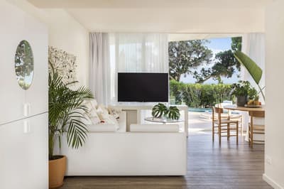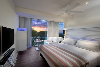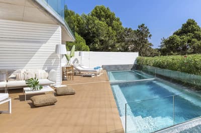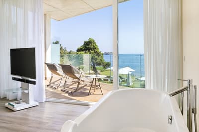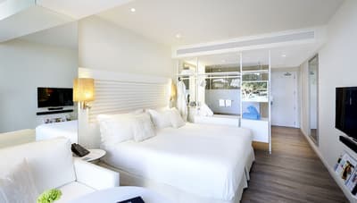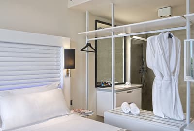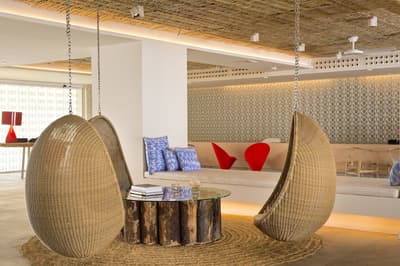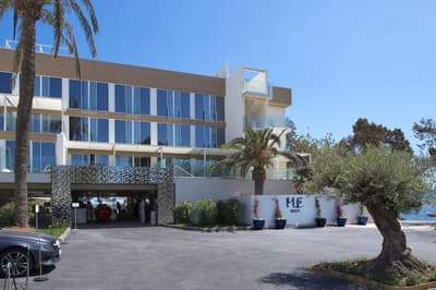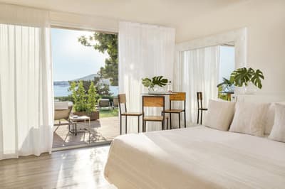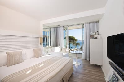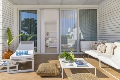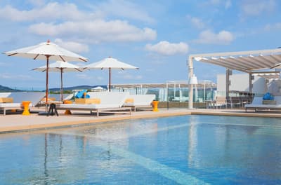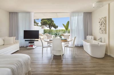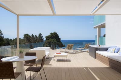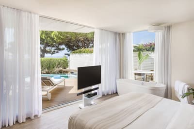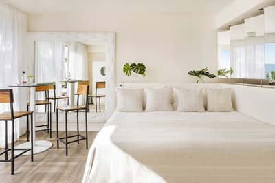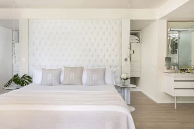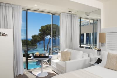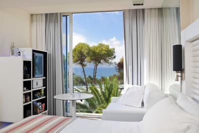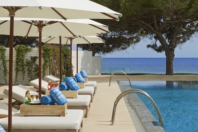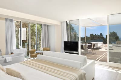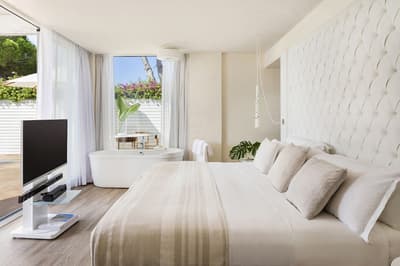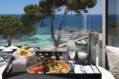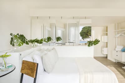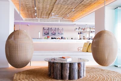 Vous avez envie de ressentir toutes les bonnes vibes de la Isla Blanca depuis votre hôtel ? Rendez-vous au ME Ibiza ! Les pieds en éventail au bord de la piscine, sur un transat à l’ombre d’un parasol ou sur le gazon sous les grands pins, à deux pas de la plage. En mode « je somnole », juste assez pour rester tranquille et se laisser bercer par la musique. Ou alors sur le rooftop très hip ! Entre le bar Radio Me Ibiza et la vue, on a l’impression d’être sur le pont d’un bateau hyper trendy. Sauf que les places à l’avant, face au dégradé de bleus de la Méditerranée, sont toujours les plus demandées et que pour un sun bed de rêve, il va falloir sortir le porte-monnaie. Des chambres douces aux soirées DJs, des massages aux cours de yoga aérien, vous pourrez vous connecter à l’ambiance cool de cette île des Baléares. Mais parce que vous êtes dans un coin assez tranquille, près de Santa Eulària des Riu et non de la dynamique Eivissa, vous devrez sans doute louer une voiture pour explorer Ibiza ! Parce qu’il n’y a pas que faire trempette dans la vie… il y a aussi partir en quête des petites criques secrètes, trouver le plus beau coucher du soleil, découvrir les paysages de l’arrière-pays et passer plein de nuits blanches, ou juste une si vous avez passé la trentaine.