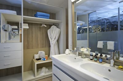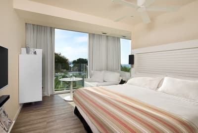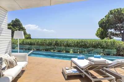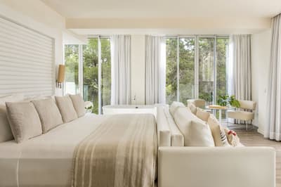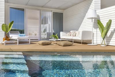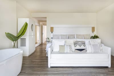 Plus spacieuse, elle dispose d’une petite terrasse aménagée de longues chaises pour apprécier le cadre relaxant. Elle profite d’une belle vue sur l’océan et la piscine. Petit coin salon avec des fauteuils confortables. Salle de bain chic avec douche à effet de pluie.