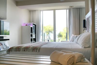 Du 3ᵉ étage, elle profite d'une vue merveilleuse sur la ville, le complexe et la végétation. Elle baigne dans une atmosphère relaxante et sereine. Petit coin salon avec des fauteuils confortables. Salle de bain chic avec douche à effet de pluie.