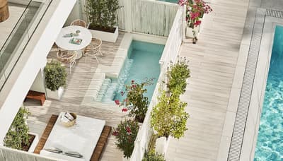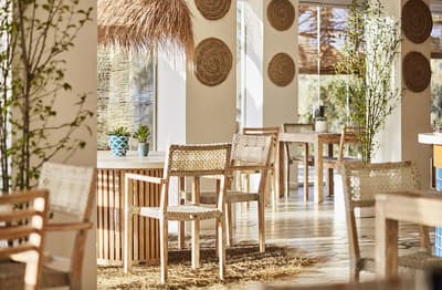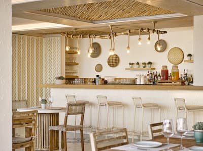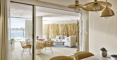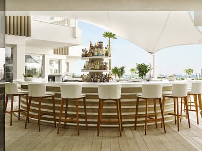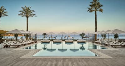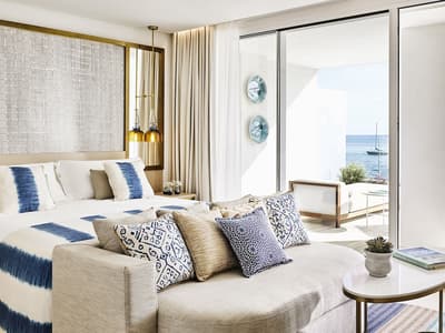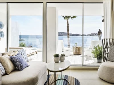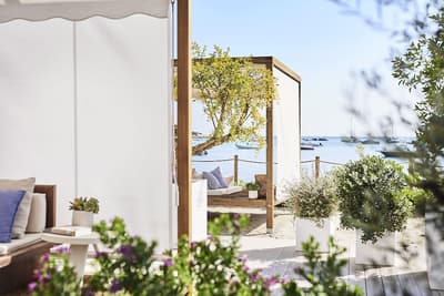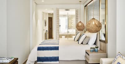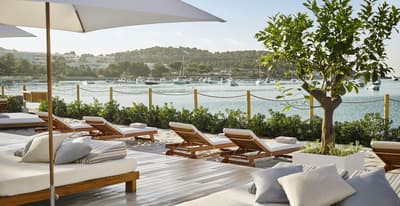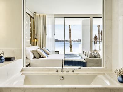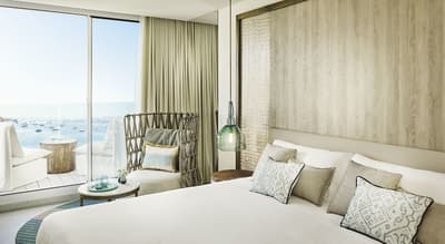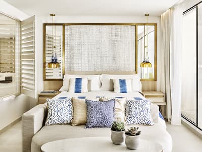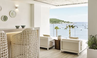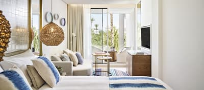 Quelle classe ! Il y a toujours ce petit truc en plus ou une touche d’élégance inattendue au Nobu Hotel Ibiza Bay, même dans le kids club avec ses jolis animaux en rotin tressé et ses doudous aux couleurs toutes douces. Les adultes auront aussi leur cocon douillet bien sûr, y compris ceux qui viennent sans les enfants. Les chambres sont hyper bien décorées : luminaires au verre ambré, coussins imprimés, persiennes, tronc d’arbre en guise de table, fleurs séchées et succulentes dans de petits pots… Les murs blancs, les touches de bleu et le bois clair évoquent l’esprit relax d’Ibiza. Il n’en faut pas beaucoup pour créer une atmosphère conviviale, mais Nobu le fait et le fait bien. Mais il n’y a pas que la déco dans la vie, il y a aussi la adults pool et ses bains de soleil géants près de la jolie baie de Talamanca, la piscine familiale et ses transats tout aussi agréables, le spa Six Senses ou encore le salon de coiffure. Et puis les restos Nobu, toujours au top, surtout le bar à sushis, incontournable peu importe la destination ! En choisissant cet hôtel, vous vous trouvez juste à l’est d’Eivissa. La jolie Dalt Vila vous fera donc de l’œil depuis les chambres avec vue… Elle n’est qu’à une petite trotte à pied ou un trajet express en voiture, un peu moins de 4 km pour être exact. C’est l’idéal pour un court séjour, non ?