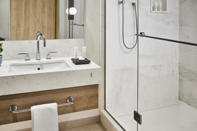 Agréable, elle a tout le nécessaire pour un séjour confortable et relaxant. Le balcon est aménagé de fauteuils confortables pour apprécier la vue sur l’océan et le complexe. Salle de bain chic avec douche à effet de pluie.
