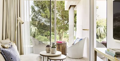 D’une simplicité exquise, elle est vraiment cosy. La grande baie vitrée laisse pénétrer la lumière naturelle dans la pièce. Elle mélange rotin et bois pour une décoration authentique et exotique. Des touches de couleur bleue ajoutent du romantisme.