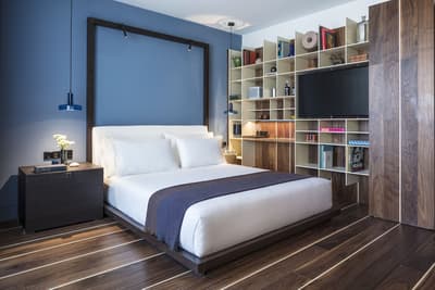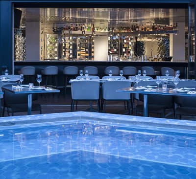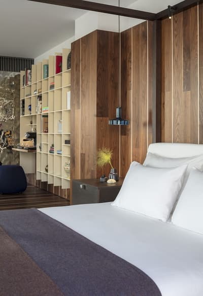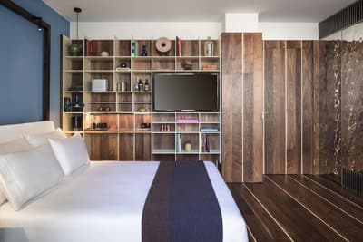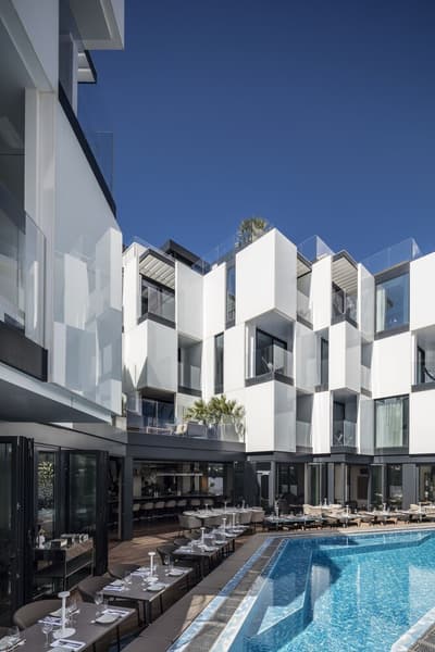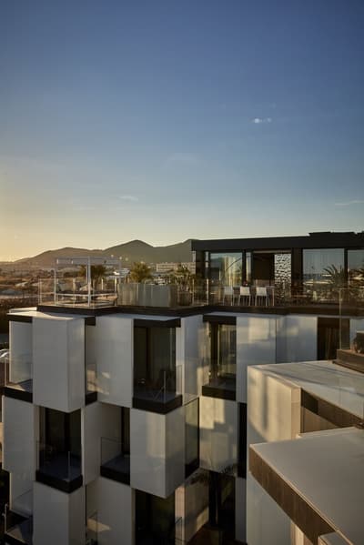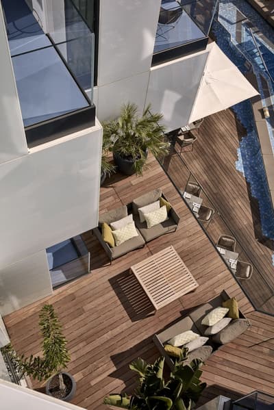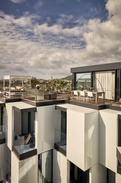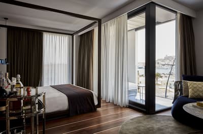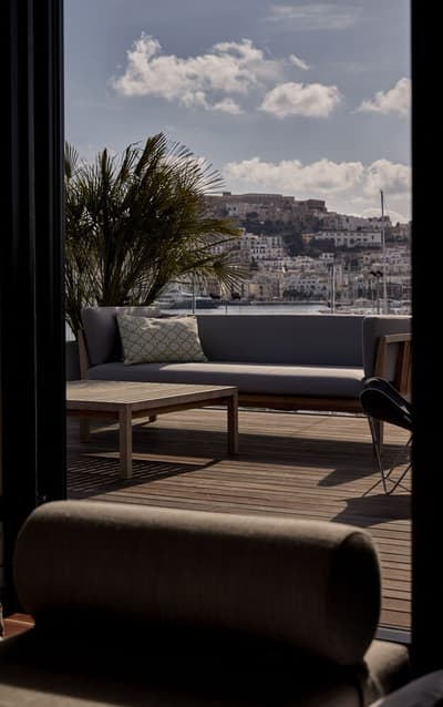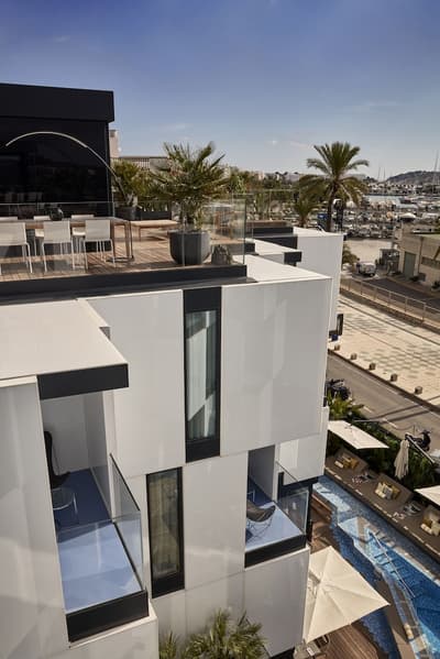 On craque pour la façade blanche et de verre du Sir Joan Hotel, très moderne mais fidèle à l’esprit de l’île : on dirait une construction LEGO ! Dans les chambres, mieux vaut ne pas souffrir du mal de mer. Miroirs en forme de hublot couronnés d’un néon, plancher en bois style yacht, panneaux inox recréant l’illusion du scintillement du soleil sur l’eau… Avec un fauteuil design ou un bureau pour siroter tranquillement un whisky, parce que vous êtes sur un bateau huppé ! Par contre, selon la catégorie de cabine, vous n’aurez peut-être qu’un mini balcon pour observer les environs. À l’attention des occupants : il n’y a pas de rooftop ici ! Sauf si vous avez choisi la super penthouse… pas une si mauvaise idée d’ailleurs. La piscine, plutôt petite, est coincée entre la terrasse du bar, quelques transats et un joli mur végétal. Mais il y a de quoi faire trempette, l’ambiance est au rendez-vous le soir quand elle s’illumine d’un vert flashy, les cocktails font envie… Et la Platja Talamanca ne se situe qu’à une quinzaine de minutes à pied donc on va arrêter de se plaindre. Le personnel de bord est aux petits soins pendant tout le séjour et vous donnera ses meilleurs tips pour explorer la Isla Blanca. Un hôtel parfait pour de courtes vacances, surtout si l’on souhaite visiter Eivissa !
