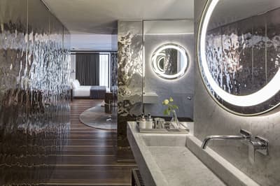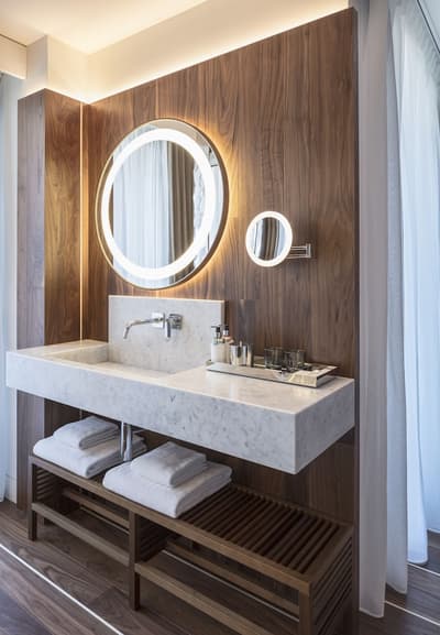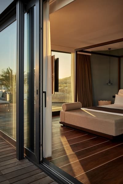 Idéale pour les couples, elle baigne dans une atmosphère romantique et sereine. Son espace extérieur est généreux avec ses 2 balcons aménagés de longues chaises pour apprécier la vue sur la vieille ville et le port. Elle dispose d’un lit en forme circulaire. Coin salon avec des fauteuils. Salle de bain chic avec douche à effet de pluie.