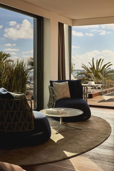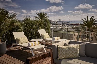 Spacieuse, elle est encore plus confortable et agréable. Son extérieur est généreux avec ses 2 balcons aménagés de longues chaises pour apprécier la vue sur la vieille ville et le port. Coin salon avec des fauteuils. Salle de bain chic avec douche à effet de pluie.