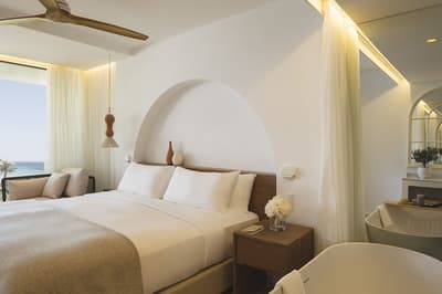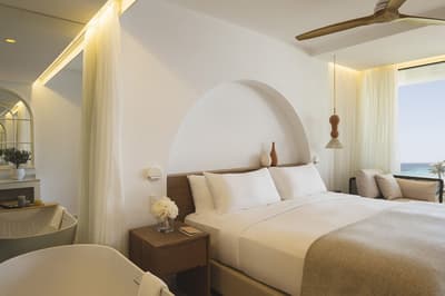 Installée face à la mer, elle profite d’une vue merveilleuse ! Cette belle chambre a tout le nécessaire pour un séjour des plus agréables et confortables. Elle accommode un grand lit idéal pour les couples. Salle de bain avec douche et baignoire.