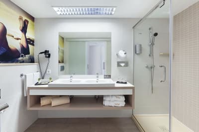 Avec son carrelage clair et ses murs blancs, elle est lumineuse. Les grands panneaux vitrés laissent pénétrer la lumière naturelle et procurent une sensation d’ouverture. Elle baigne dans une atmosphère légère et sereine. Quelques touches de couleurs vives lui donnent du peps.