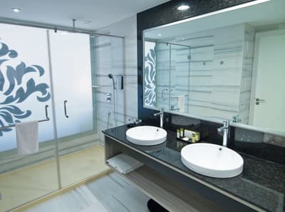 Le balcon aménagé de belles chaises profite d’une belle vue sur le complexe. Elle peut accueillir 1 lit Queen ou 2 lits simples et dispose d’un petit coin salon avec un canapé-lit. Salle de bain chic avec douche à effet de pluie.