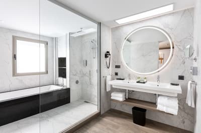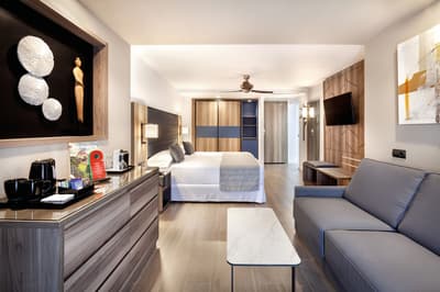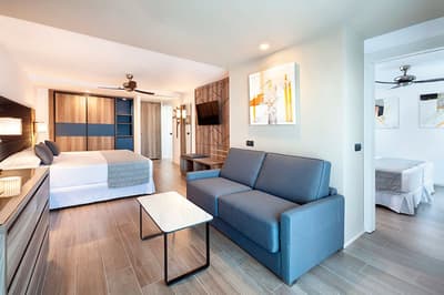 Vue depuis la mer, le Riu Palace Oasis semble surgir des impressionnantes dunes de Maspalomas. En toile de fond, les premières montagnes de Gran Canaria évoquent instantanément l’Atlas. Il ne manque plus que quelques chameaux pour se croire au Maroc ! Chez Riu, on ne fait jamais les choses à moitié. Tout est n’est que grandeur et démesure. Et ça commence dès le hall, impressionnant, dominé par le marbre et un lustre monumental. Des fauteuils moutardes au look vintage et quelques touches années 1960 apportent du peps et de la couleur. Vous êtes bien dans un 5 étoiles, pas de doute ! Dans les jardins, c’est une vraie claque visuelle. Des centaines de palmiers, 4 piscines, une plage parsemée de transat où chiller. Paradisiaque vous dites ? Même carrément magique ! Mais le show ne fait que commencer. Du côté des restos, c’est aussi la folie. Dîner-concert à deux pas de la piscine, buffet gargantuesque, show cooking, bar à cocktails. Le resort fait largement le job et même plus encore. Avant de partir à la conquête des dunes et de rejoindre l’océan, faites tout de même un détour par les chambres. Si leur décoration, à la fois sobre et contemporaine, est plutôt classique, les prestations sont démentes. De quoi déconnecter en douceur avec un panorama idyllique sur le littoral.