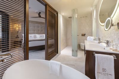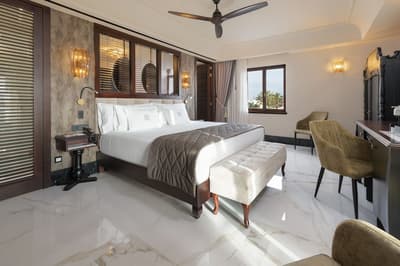 Cette belle suite profite de confort et d'espace. Elle permet un accès aux installations exclusives du complexe. Fauteuil et bureau dans un coin de la chambre. Salle de bain chic.