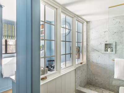 L’ensemble bénéficie d’un design Rita Konig personnalisé avec des murs lambrissés dans une magnifique nuance de bleu bungalow, des œuvres d'art originales de la collection privée et des planchers de bois franc. Vous pourrez vous détendre près de la cheminée après vos activités de la journée et vous reposer dans la chambre dotée d’un lit king ou queen avec des draps de luxe. La salle de bains en marbre est équipée d’une douche et d’une baignoire signature avec luminaires waterworks. Le tout dans une ambiance cosy !