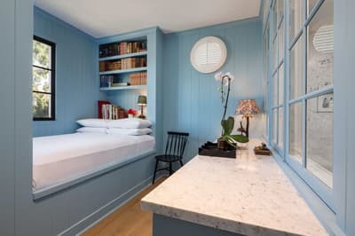 L’ensemble bénéficie d’un design Rita Konig personnalisé avec des murs lambrissés dans une magnifique nuance de bleu bungalow, des œuvres d'art originales de la collection privée et des planchers de bois franc. Vous pourrez vous détendre près de la cheminée après vos activités de la journée et vous reposer dans la chambre dotée d’un lit double intégré avec des draps de luxe. La salle de bains en marbre est équipée d’une douche et d’une baignoire signature avec luminaires waterworks. Le tout dans une ambiance cosy !