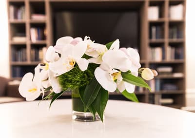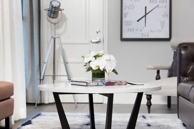 Chic et raffinée, elle est très élégante. Dominée de blanc, elle est résolument design. Elle laisse pénétrer la lumière naturelle pour une pièce lumineuse et accueillante. Le mélange de bois, de métal et de verre rend l’ensemble harmonieux. Quelques touches de couleurs vives lui donnent du peps.
