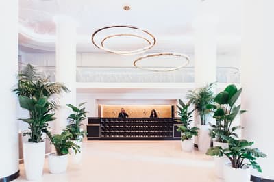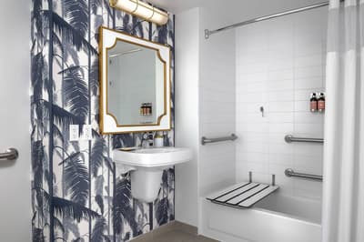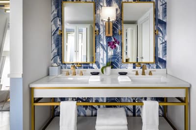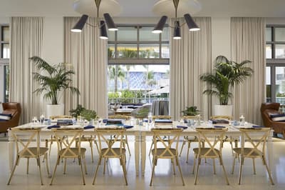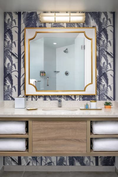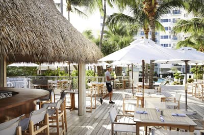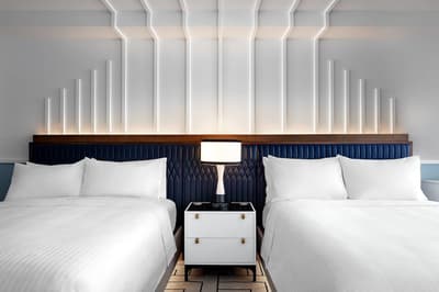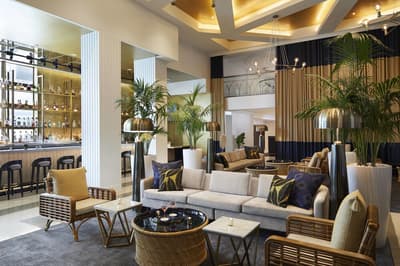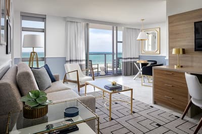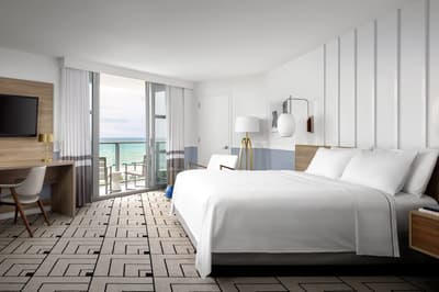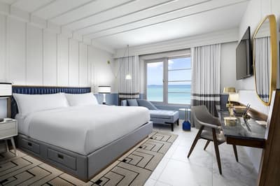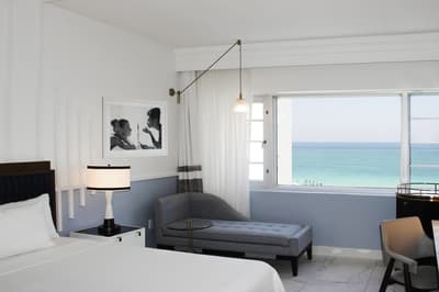 Une jungle de palmiers, quoi ! C'est juste ouf ! Et au milieu se cache une piscine bordée de gazon absolument magnifique, avec des cabanes et transats blancs qui transpirent le luxe. Au loin, des escaliers vous emmènent tranquillement à la plage où vous aurez droit à un service royal. Quel parcours ! Bah ouais, c’est pas tout ça mais avec tous ces palmiers qui cachent la vue, on en oublierait presque l’océan. En tout cas, depuis le rez-de-chaussée parce que la vue depuis les chambres est extraordinaire. Toute cette verdure tropicale qui se mélange à cet arrière-plan de sable fin et d’eau bleu turquoise… vous vous imaginez voir ça tous les matins en ouvrant vos rideaux ? Le paradis ! En plus de tout ça, l’hôtel fait partie de l’Autograph Collection du groupe Marriott, voilà pourquoi son design est si beau. C’est peut-être aussi car il a été rénové récemment pour plus de luxe, sans toutefois toucher au style art déco, bien fidèle à l’esprit de Miami Beach. Tous les hôtels de la rue sont-ils comme ça ?! Mais surtout, le trolley gratuit s’arrête juste devant l’hôtel… En voiture, Simone ! Pour des recommandations, allez voir le concierge, il est là 24h/24 !