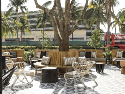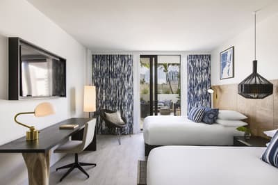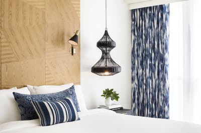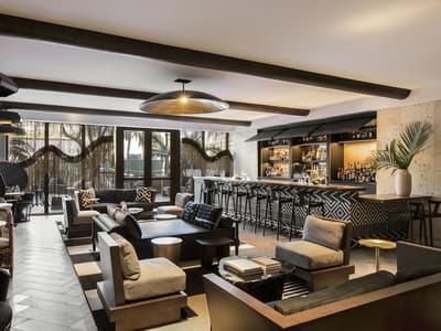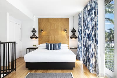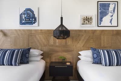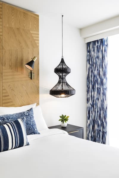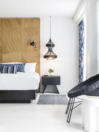 Pour une fois, on va essayer d’aller à contre-courant : même s’il a toutes les clés en main sur le papier, ne vous laissez surtout pas avoir par le rooftop et sa piscine ! Ce n’est même pas la meilleure partie de l’hôtel. Comment ça, bizarre ? Et oui, ça doit sûrement vous étonner en le voyant sur les photos mais c’est vrai. Et pour être honnête, il ferme assez tôt en début de soirée donc vous ne pourrez pas vous y éterniser. Voilà pourquoi une fois passée l’heure, il faudra connaître les endroits où vous rabattre pour ne pas vous retrouver à errer dans les couloirs telle une âme perdue sans son transat. Pourquoi pas aller voir du côté du patio avec son bar extérieur et ses cocktails divins ? Avec ses bancs en bois et son arbre, l’ambiance se veut très naturelle et cosy. On parie sur quelques guirlandes lumineuses allumées au cours des soirées et l’ambiance est parfaite pour prendre un verre. Si ça vous suffit pas, les chambres sont carrément pas mal : balcons et terrasses avec vue vraiment cool sur l’autre piscine. Et oui, surprise, une piscine peut en cacher une autre ! Sans parler des studios et des lofts avec des petites touches de décoration très appréciables. Aucun doute n’est permis, vous vous sentirez vraiment bien au Kimpton Angler’s !