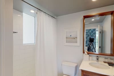 Dans une décoration contemporaine, elle est dotée d’un mobilier tendance, de luminaires design et se complète dans des tons neutres. La chambre comporte un très grand lit et la salle de bains est bien équipée. Ambiance relaxante !