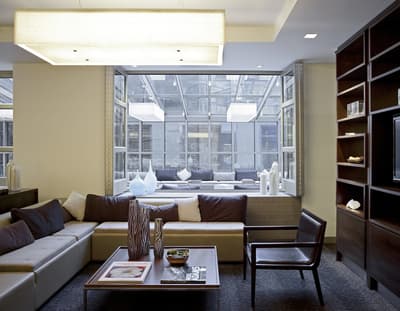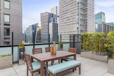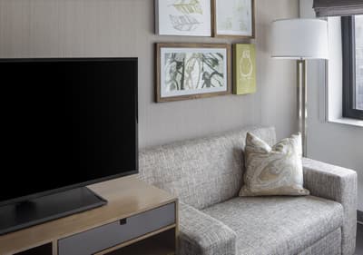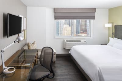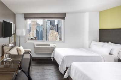 Vous êtes d'un naturel indépendant ? Peu vous importe que le mobilier de votre chambre soit signé d'un grand designer ? Faire des courbettes pour obtenir un menu dans un restaurant huppé vous rend dingue ? On a une adresse qui ne s'embarrasse pas du superflu et qui n'a jamais été aussi bien placée ! C'est en plein Times Square que l'Element vous accueille, dans un hôtel qui a tout compris du touriste plus pressé que le New Yorkais. En famille ? Les chambres sont communicantes. Petit budget ? Jouez-la Top Chef à New York dans votre cuisine intégrée ! Vous avez la flemme de ressortir après avoir parcouru toute la ville ? Une épicerie ouverte 24 heures sur 24 a pensé à tout ce qu’il faut dans le lobby. Bref, un hôtel couteau suisse, qui ne lésine pas sur rapport qualité-prix et qui propose même un ptit déj' gratuit. La déco va à l'essentiel — vos stories Instagram seront plus trépidantes dehors qu'à l'intérieur—, mais les parquets foncés fonctionnent plutôt bien avec les lits au carré et certains murs osent le vert amande. En vrai, il suffit de relever les stores bateaux pour tout oublier. Le spectacle des toits de Manhattan à perte de vue déçoit rarement. Et ce qui ne déçoit pas non plus, ce sont les facilities. Un centre de remise en forme, des stations de rechargement pour les voitures électriques, des salles de bains tout confort et un rooftop à 360 degrés !