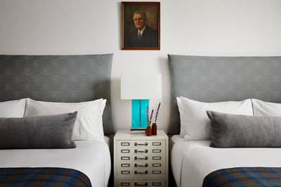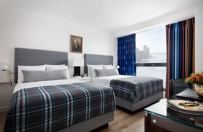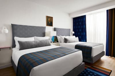 Vous aussi, la fac, c’était vos plus belles années ? Allez, c’est parti pour un bond dans le passé alors ! Dès le lobby de cet hôtel ouvert au début de l’été 2021, vous n’êtes pas accueillis par des réceptionnistes mais par le fameux Flyboy (dans le milieu, c’est comme ça qu’on l’appelle), une immense statue aux lunettes d’aviateur. Il tient son ampoule au-dessus de vous comme pour vous inspecter et vérifier votre dossier d’inscription. C’est bon, vous aviez eu la mention bien au semestre dernier ? On vous a donné votre clé de chambre qui ressemble à une carte étudiante ? Parfait, vous pouvez rejoindre votre chambre, qu’on appellera dortoir pour rester dans le thème. Coloré et contemporain, ce dernier se révèle bien plus spacieux que les hôtels — euh, pardon, villages universitaires — de Manhattan. Pour le reste de l’hôtel, tout ressemble à une bibliothèque universitaire, sauf qu’ici on ne vous dira pas « chut » toutes les cinq minutes car vous bavardez trop avec votre voisin. Il ne vous reste plus qu’à profiter du bar sur le rooftop avec vue à 360 degrés inédite depuis la Roosevelt Island. Entre le Queens et Manhattan, il n’y a qu’un pont. Et c’est exactement ici que vous vous trouvez !