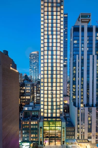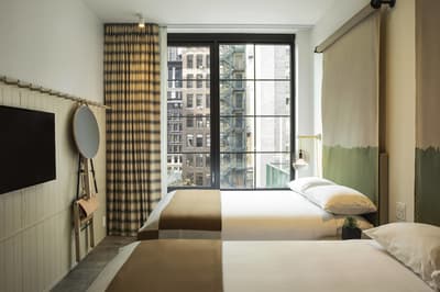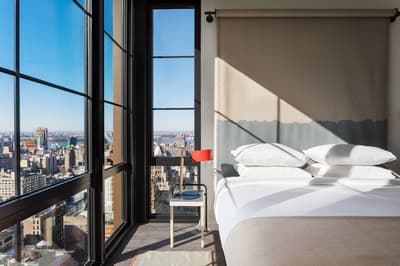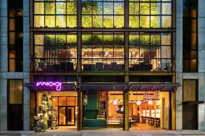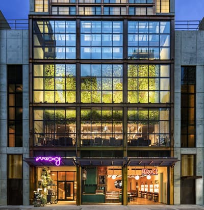 On dit toujours qu’il est important de préserver son jardin secret... mais jamais qu’il faut descendre au Moxy Chelsea pour en avoir un ! Sur le trottoir d'en face, prenez le temps d’admirer l'incroyable mur végétal emprisonné dans la façade en verre et en acier de l'hôtel. Juste avant d'entrer chez Alice au Pays des merveilles : un des célèbres fleuristes de la Grosse Pomme a élu domicile dans le hall et vous en met plein le nez, dès votre arrivée. Les employés au doigté de fée composent des bouquets incroyables et vous feront vous demander si vous ne vous êtes pas trompé d’endroit. Rassurez-vous, passé le flower shop, un concierge vous attend tout sourire avec votre résa déjà en main. Le Moxy Chelsea cultive une ambiance plutôt chic, romantique et décontractée. Et les voyageurs qui ne peuvent pas s'empêcher de poster sur les réseaux, il connaît : pensez à vous taguer au Moxy sur Insta, il y a de grandes chances que vos selfies défilent sur l'écran du lobby ! Côté food, on vous fait déguster des fleurs comestibles (et aussi des pizzas made like in Italia), tandis que le bar du deuxième étage inonde ses cocktails de saveurs florales. Et ici, comme toutes les plantes qu'on chouchoute, vous aurez un espace privilégié dans une des chicissimes chambres aux baies vitrées d'angle : la vue est toujours aussi belle quelle que soit la saison. Histoire de profiter au max' avec un bain de soleil, direction le rooftop, qui vous fera sûrement prendre racine !