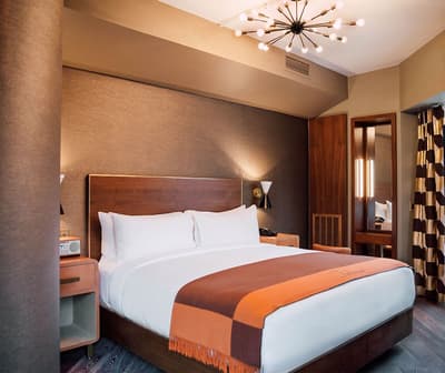 Installée aux étages supérieurs, elle profite d’un cadre calme et serein. Purement confortable, cette belle suite a tout ce qu’il faut pour un séjour des plus agréables. La grande baie vitrée profite d’une vue merveilleuse sur la ville animée. Idéale pour un couple, elle accommode un lit king et dispose d’un bureau dans un coin de la pièce. Salle de bain chic avec douche à effet de pluie.
