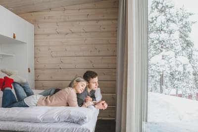 S’endormir face aux aurores boréales et se réveiller grâce à la luminosité brillante de la neige sur les sapins... L’expérience Laponie, version cocooning !