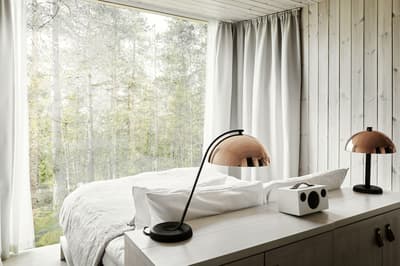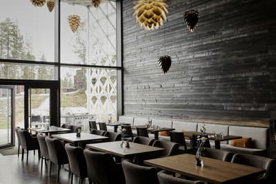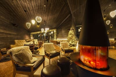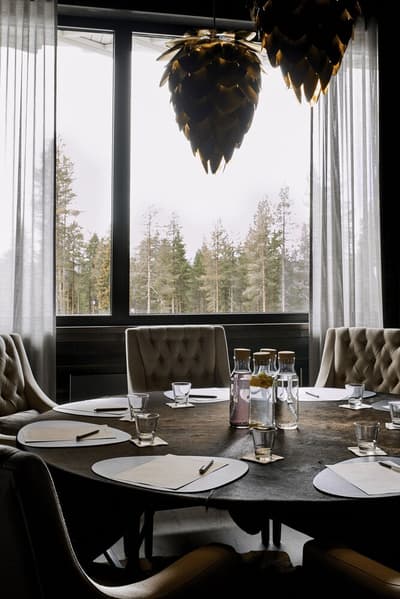 Spacieuse, elle est conçue pour une détente ultime et un confort de luxe et peut accueillir des familles encore plus nombreuses. Détendez-vous et admirez la vue exceptionnelle sur la forêt environnante depuis votre baignoire panoramique grâce aux baies vitrées réalisées à l'aide des dernières technologies en matière d'intimité. À noter que le salon peut être transformé en salle à manger à l'aide des meubles mobiles sans compromettre le design et la sensation d'air dans toute la suite.